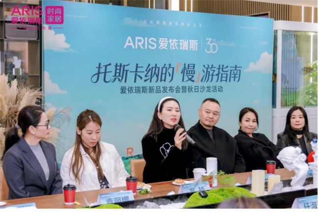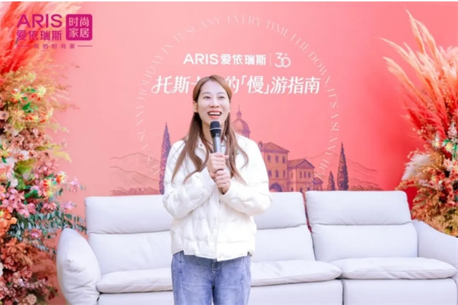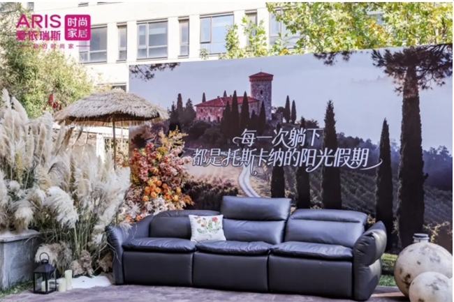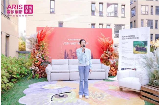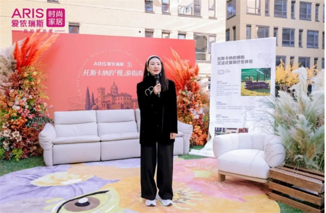 在秋日暖阳与芦苇摇曳的美拉德风中,爱依瑞斯新品“托斯卡纳沙发”成为全场焦点。爱依瑞斯品牌运营中心总经理隋艺昆在活动现场带领现场嘉宾进行新品深度品鉴。她介绍,这款慵懒系列首发产品,以意大利托斯卡纳度假圣地为灵感,融合当地阳光、山丘与美食的自然意象,推出马苏里拉奶酪白、松露黑、落日橙三款经典配色,适配90% 以上的现代家居场景。